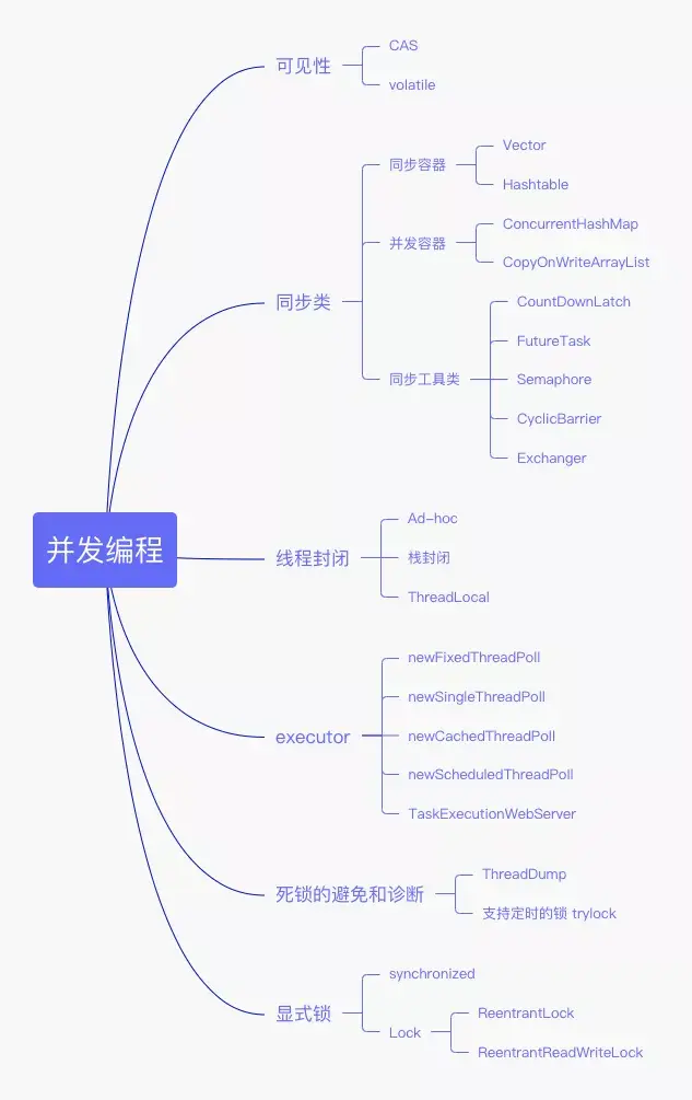 你在学习编程的时候,一定要形成自己的知识体系,建议你通过思维导图来梳理知识点。比如说并发编程这块的知识点如下图所示。