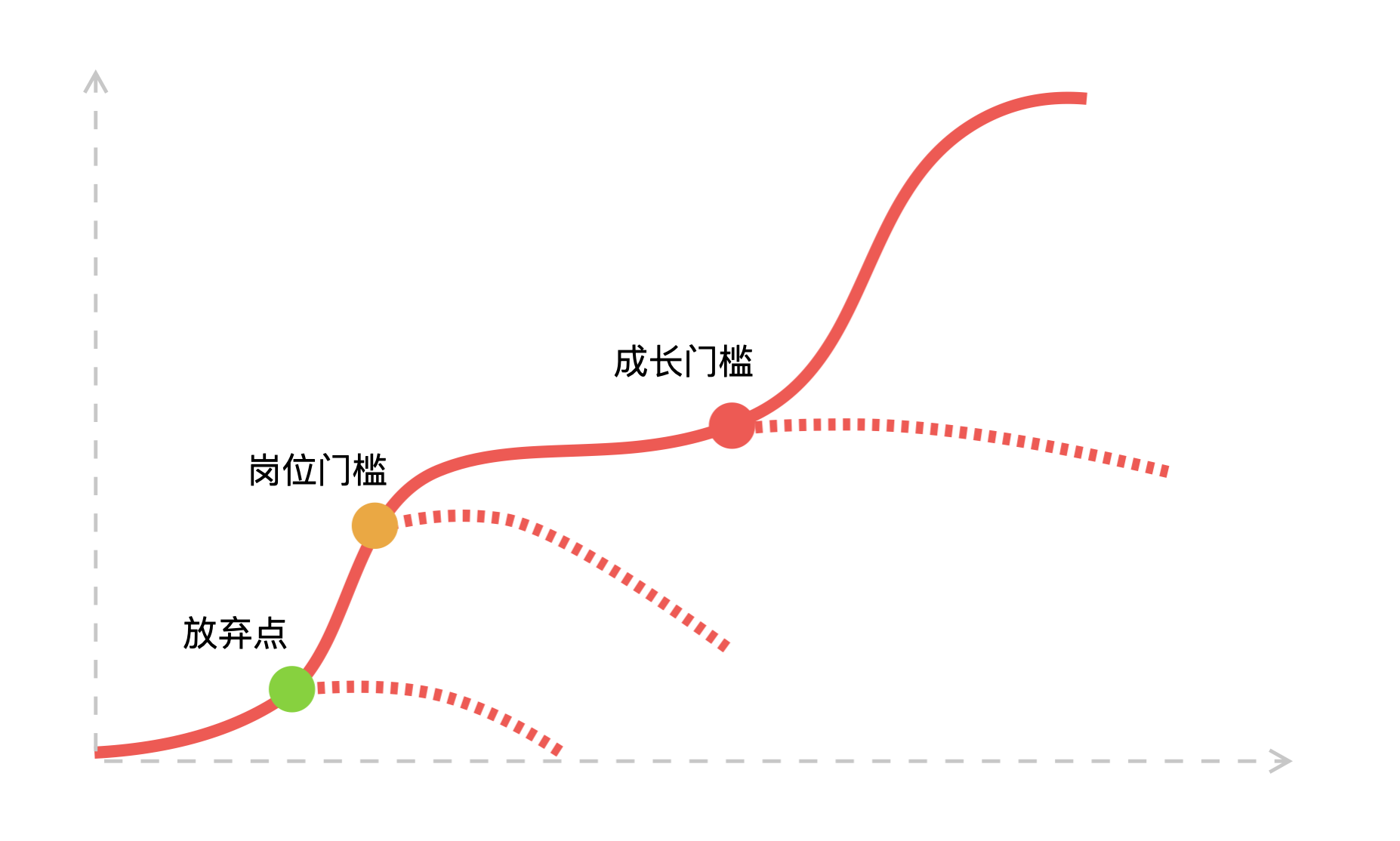 在从放弃点到岗位门槛的阶段,有一些人能够通过系统的训练学习好,还有一些人就是野路子,没有系统训练,始终达不到门槛,只能从入门到放弃。