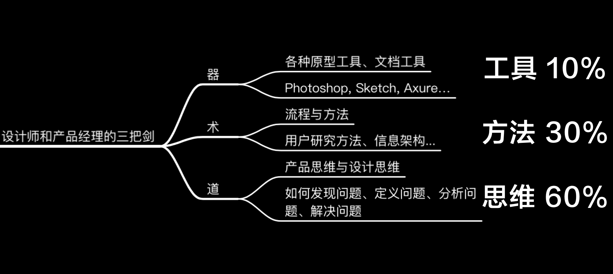 在训练营的产品思维、设计思维、运营思维的课里,我给大家讲过,我们的能力可以分为器、术、道三个层次。器是工具,例如各种软件工具等等。术是方法,例如用户研究、数据分析的方法等等。道是思维,例如用户中心的思维,产品、设计、运营的底层逻辑等等。