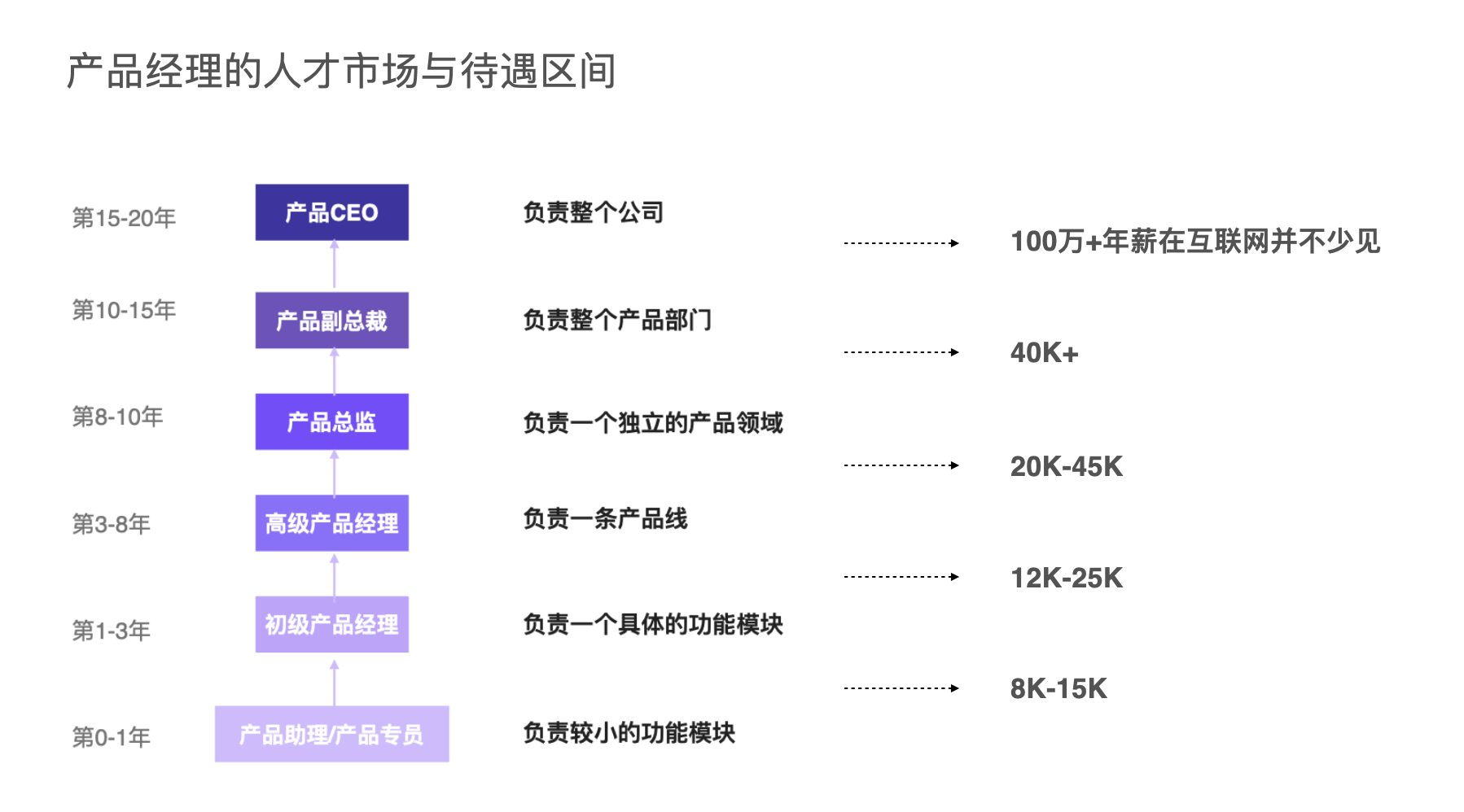 所以当你目标还不是特别清晰时,可以选择先从产品经理入手,然后不断寻找自己的方向。