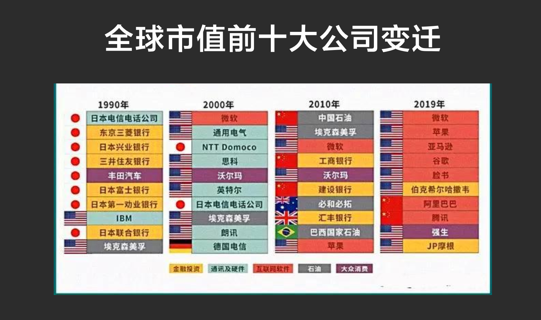 让我们看看这里的表格,全球市值前十的公司,1990年代是石油公司和银行,2000年代是电信公司,2010年代开始大部分都是互联网和科技公司。人类社会经过农业革命、工业革命之后,现在正在进行着信息革命。现在中国的互联网走在全球的前列,未来全世界还会有更多的国家实现互联网的普及。这中间都有巨大的机会。