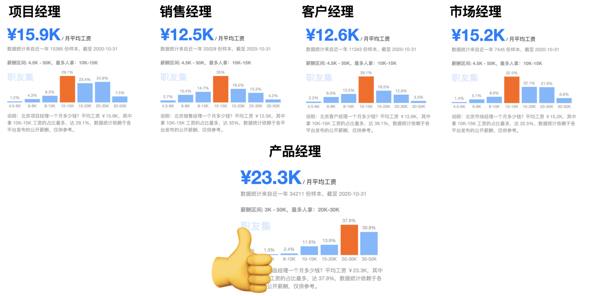 互联网的产品经理平均薪资是每个月23.2K。可以看出产品经理的平均薪资是远大于传统的项目经理、销售经理、客户经理、市场经理的。