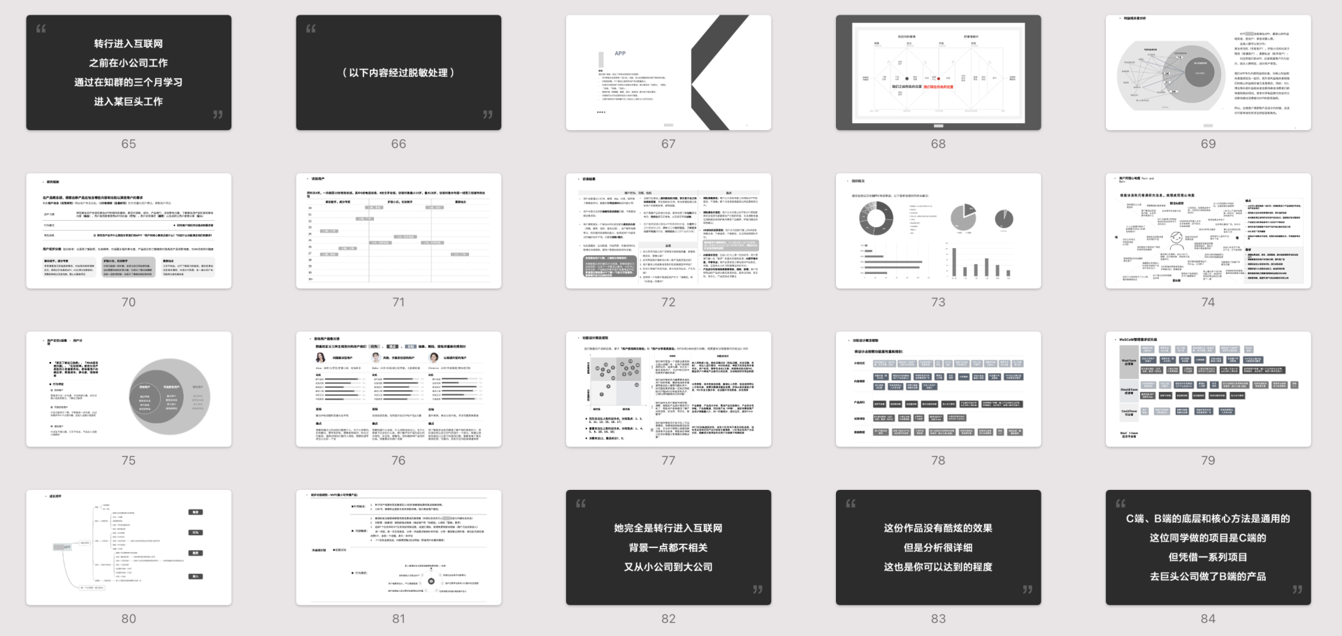 我希望你无论是选择产品经理、设计师、运营、程序员方向中的哪一个,在面试的时候,能够和面试官说,这是我的作品,然后从容的把自己的项目作品展示给面试官,等待着面试官提问。这样一方面你在展示自己的能力,另一方面也能够让面试官对你的提问更有针对性,你主动引导了面试官。这或许可以说是一种面试技巧。