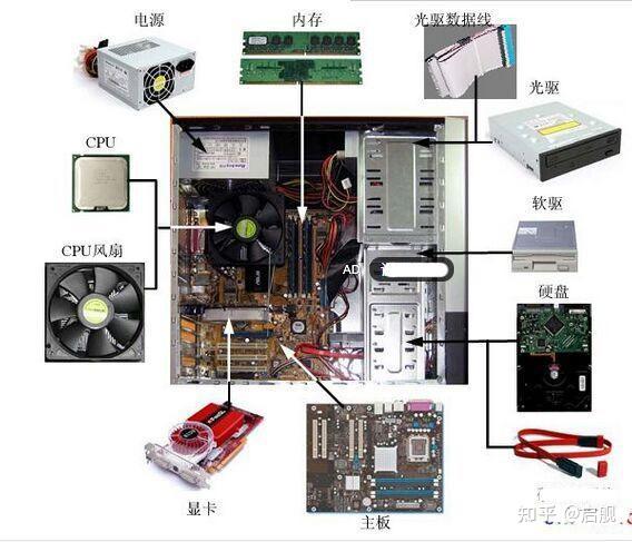 关于计算机组成,我这里简单讲一下,首先是计算机硬件构造,一台电脑正常运行需要以下几个主要部件: