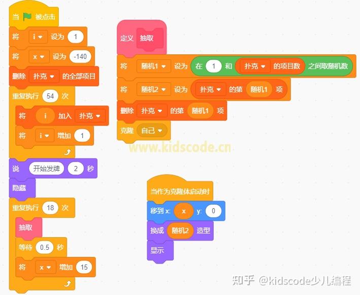 1、18张扑克,学会使用克隆,通过重复执行18次,克隆自己,每个克隆体随机一个造型即可;