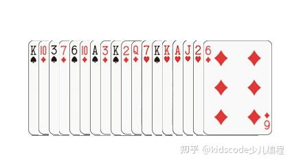 难在哪?我们还是按照常规思路一步步来,要将发出的18张牌排序,那么我们首先可以通过列表存储这18张牌的造型编号,也就是从1-54中取出的18个数字,但是我们不能直接对这18个数进行排序。因为54张牌里有四种花色,每一种13张,比如13我们代表的是红桃K,那么14就是另一个花色(黑桃A,如图),也就是说列表中1、14、27、40都是A,他们是一样大的,只是花色不同。