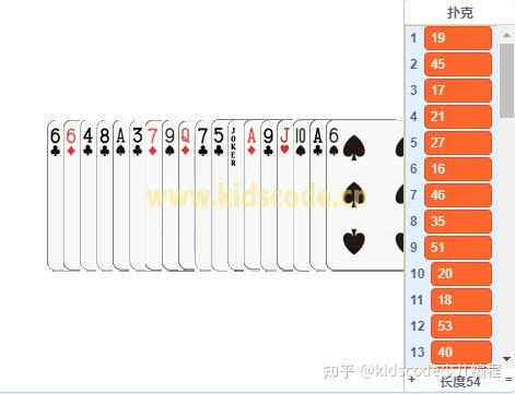 看到这个规律我们就需要设计另一个算法,要将存储的18个数值转换为牌面值,其实算法很简单,就是用列表中的数去除以13,取余数即可,如果余数为0就是K,我们用数字13代替。这样所有18个数就是1-13范围的数据了,代表A——k,再次排序就是扑克的牌面顺序了。