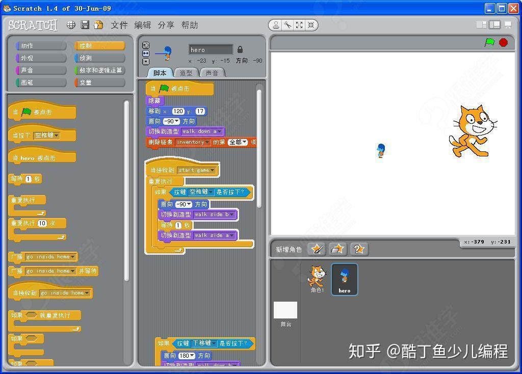 代码编程由于Scratch模块数量有限,难以实现复杂的算法,主要是用来培养少儿的逻辑思维能力、思维方式等,以游戏、音乐、动画为主。scratch案例孩子不用记住命令不代表不需要知道命令。积木模块包括8个大类,100多个功能。包括了过程一个完整程序的每个环节,甚至数组和函数。这些图形化的积木使用需要老师或者家长正确引导。孩子从模仿的过程中,能感悟到条件语句,循环语句,判断。能理解参数和命令的区别。让孩子理性的总结出来是很困难的,引导是必须的。