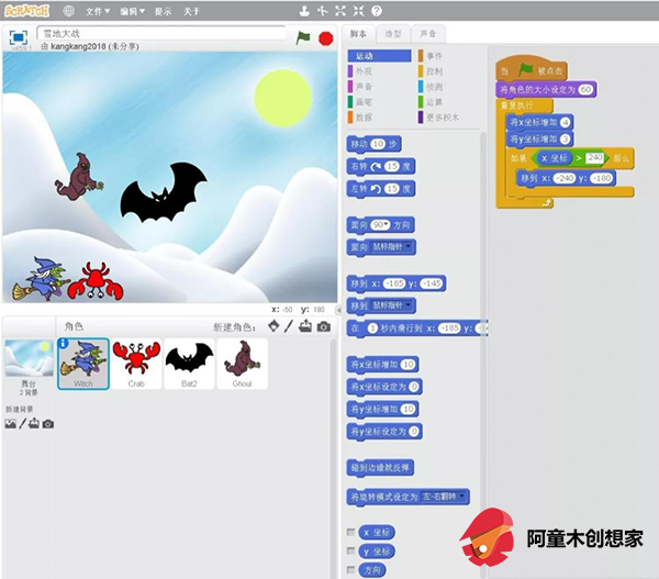 鬼怪的的程序,从左到右,然后返回。 家有五六岁以上的小孩,都可以试试这个Scratch编程,可以当做游戏玩。