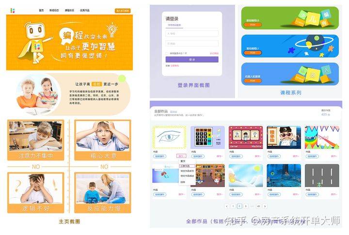 1.首页:介绍少儿编程的优势和对孩子的好处;介绍课程体系;介绍scratch;学生优秀作品