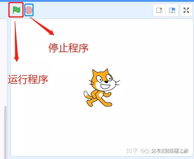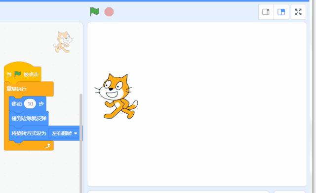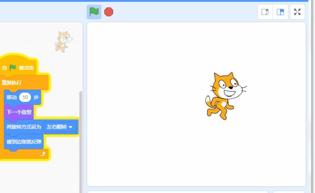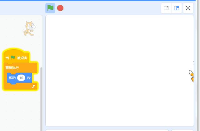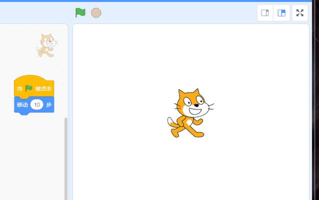 (第一块积木)点击右边绿色的旗子,可以看到右边区域的猫猫稍微移动了一下,效果不太明显,点多几次就会发现猫猫真的在移动了。如果猫猫跑到了边缘不见了,可以点击尾巴将它拉回来。