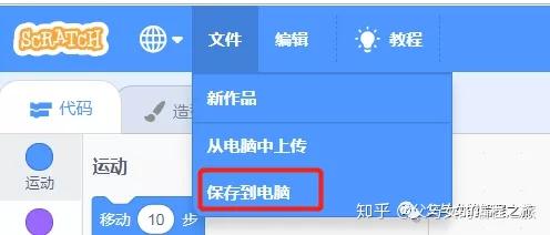 最后说一下程序保存方法,左上角点击“文件”,选择“保存到电脑”即可将刚刚做好的程序下载到自己的电脑里,下次再用时可以选择”从电脑中上传”。至此,这期的Scratch入门学习暂告一段落了。