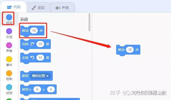 先将左边的第一块蓝色编程积木“移动10步”,拖到中间白色区域中,随便找个位置放下;