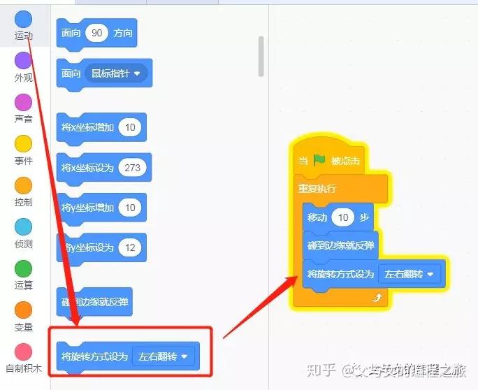 在左边点击“运动”,下拉找到“将旋转方式设为[左右旋转]”这块积木,将它放到积木组合里,如图: