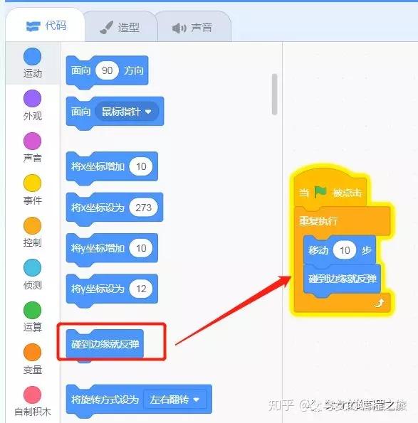 在左边点击“运动”,下拉找到“碰到边缘就反弹”这块积木,将它放到积木组合里,如图: