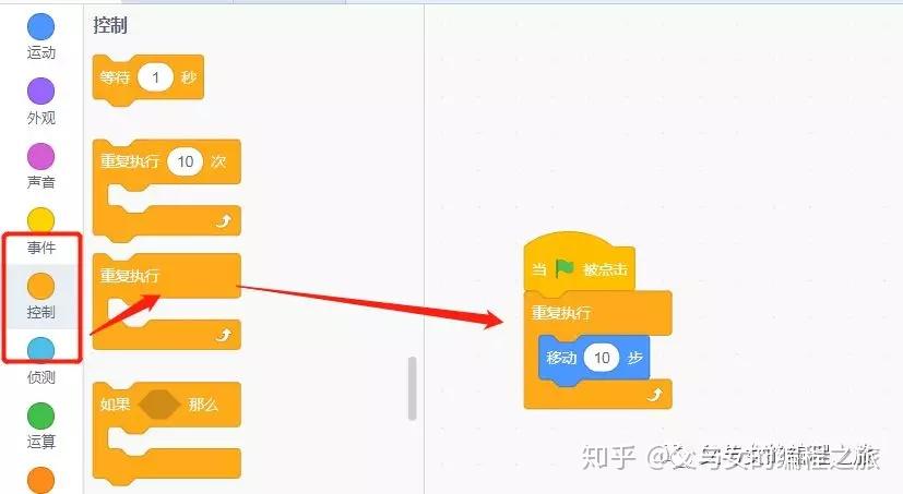 在左边点击“控制”,选择第三块积木“重复执行”,将三块积木重新组合一下,如图