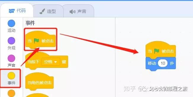 (第一块积木)再在左边点击“事件”,出现黄色的编程积木,挑选第一个,拉到中间放下,再将两块编程积木拼起来。