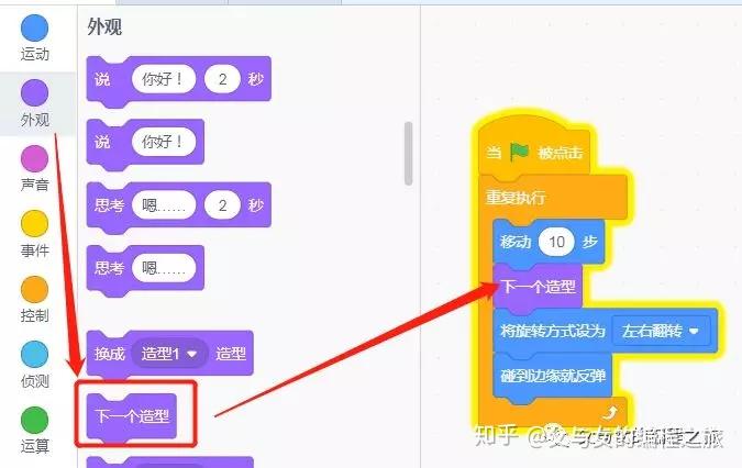 在左边点击“外观”,下拉找到“下一个造型”这块积木,将它放到积木组合里,如图: