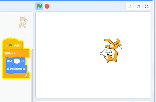 这时猫猫的跑步时会出现造型动作了。当中的缘由,你们先探索一下。就这样通过六块积木组合,我们做了一个会不停来回跑步的猫猫。