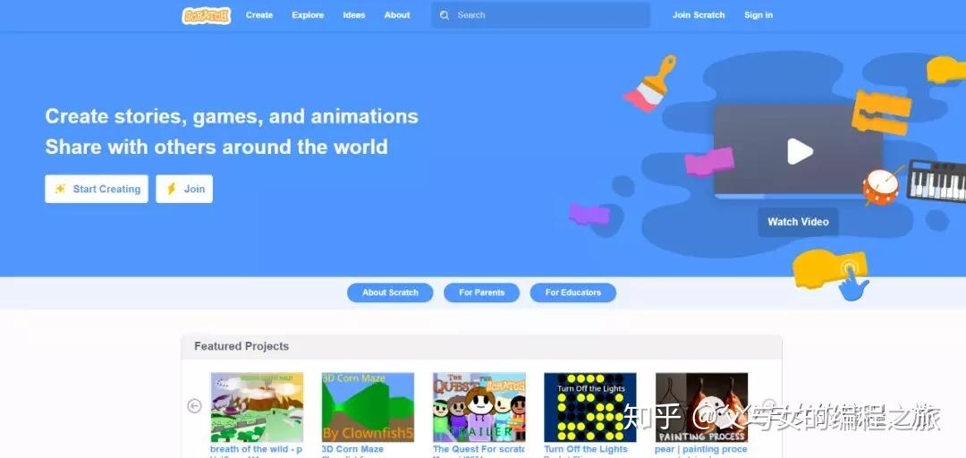 在浏览器上打开https://scratch.mit.edu/,你将会看到这个画面