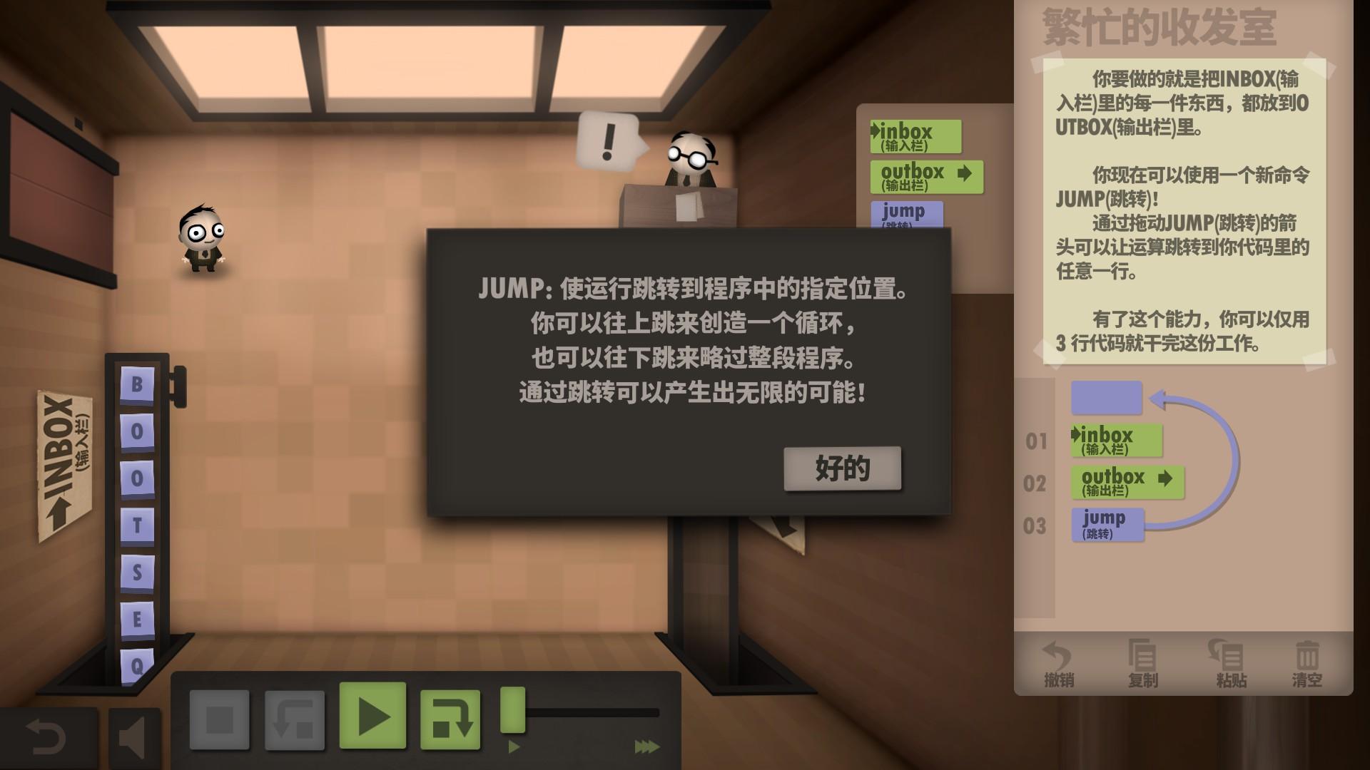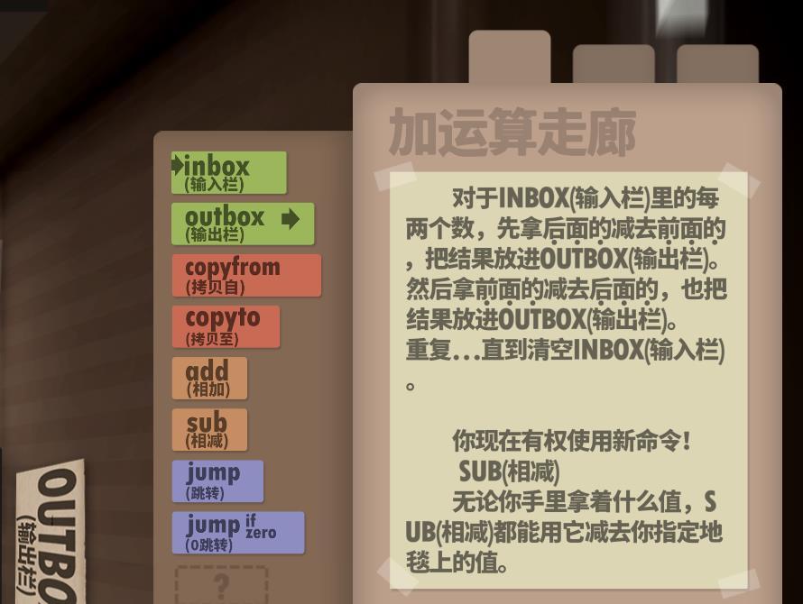 图片来源:《程序员升职记》游戏截图和 TIS-100 差不多(但画风上完全碾压了有没有),这些指令和现实世界中的汇编语言(怎么又是你?)非常类似,你的角色将从一个 inbox(输入流)读取数据,一些临时数据还可以放在地板(寄存器)上,经过比较处理和循环之后,将结果放到 outbox(输出流)中。