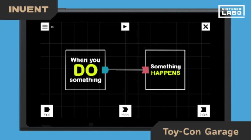 图片来源:labo.nintendo.com我们常见到面向对象,面向过程的编程方式,而 Labo 采用的是已经封装好的事件触发驱动的编程方式。简单来说,就是设定好当你对 Joy-Con 、 Toy-Con 或是机器本体做了什么事的时候,该触发什么效果。编程的方式也简单明了,把代表事件的 Input 方块,和代表触发效果的 Output 方块用线连起来就可以了。