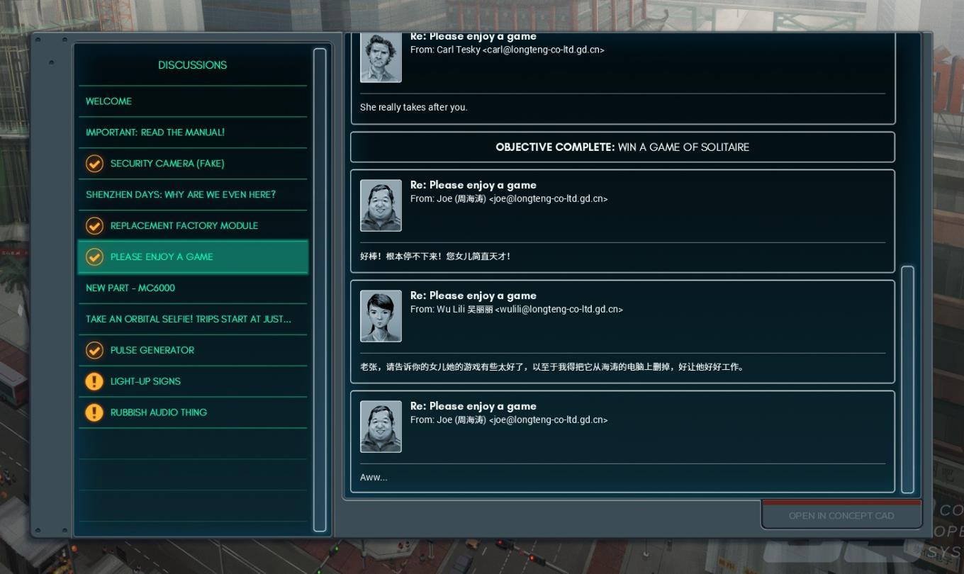 图片来源:《深圳IO》游戏截图相对来说,《深圳 IO》的叙事深度更加丰富多彩,你将扮演一名跑到深圳华强北打工的外国程序员,专门为各种电子设备编写嵌入式程序。在工作中,你不但能接触到其他同事,甚至还能在电脑上开一个麻将版本的空当接龙来摸鱼…