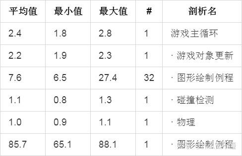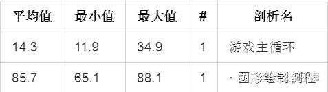 (1)图形绘制例程占用了85.7%的帧率。 (2)除了图形绘制例程之外的其他部分占用了14.3%的帧率。 (3)图形绘制例程在游戏主循环中被调用(通过缩进标示) (4)游戏主循环应该使用100%的帧率,但因为图形绘制例程在游戏主循环中被剖析,因此游戏主循环的帧率要减去图形绘制例程的帧率。 (5)游戏主循环最高使用了34.9%,而平均值只有很低的14.3%,这说明游戏主循环中的一些代码周期性影响帧时间。这些代码也许是人工智能代码或碰撞监测代码,需要增加更多的样本来使用剖析器定位。 (6)游戏主循环和游戏图形例程在每帧中只被调用一次(通过#列标示)。