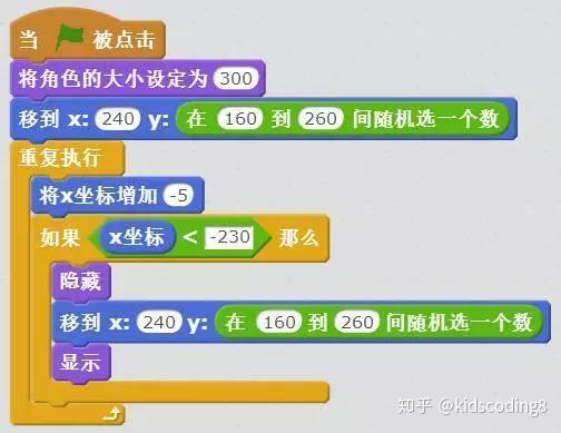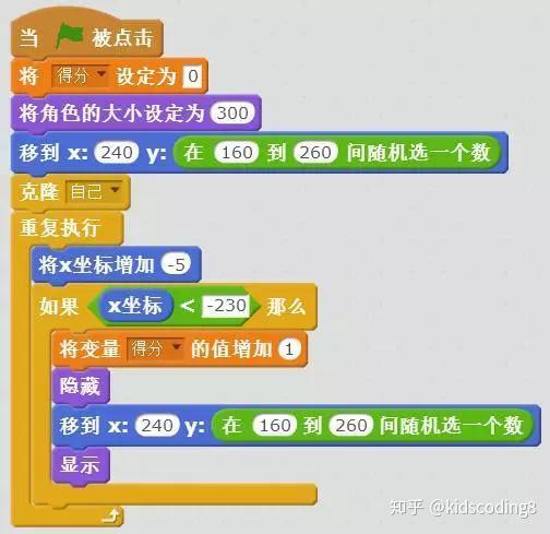 这里不用障碍物“碰到边缘”为条件触发隐藏,因为障碍物一直都是贴着边缘的,所以用障碍物的X坐标为条件来判断是否到达舞台的最左边。