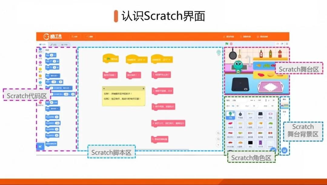 Scratch最大的特点,是它的可视化积木式编程系统。使用Scratch语言编写动画、游戏是十分直观的过程。小朋友只需要跟着老师像搭积木一样,从左侧功能区拖动不同的指令组合起来,就可以创作出自已喜欢的音频、动画、游戏等作品。