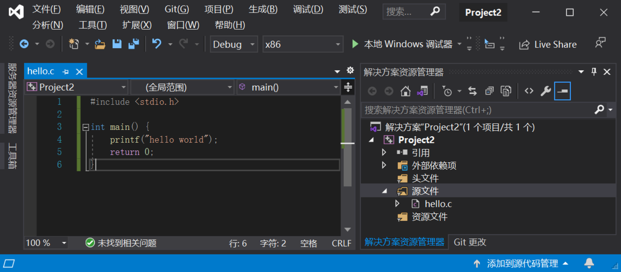 耐心地等待。安装完成后地那一刻,我听见电脑风扇在疯狂地呐喊。顾不上那么多了,新建一个空白项目,然后在源文件中添加一个 hello.c 文件,把之前“hello world”的代码复制过来,如下图所示。
