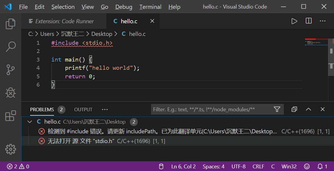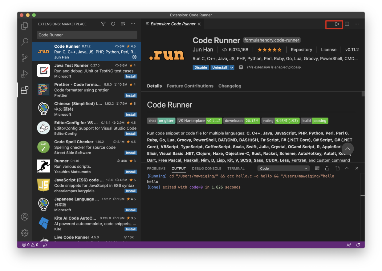 这里再推荐一个牛逼的插件 Code Runner,我的一个朋友韩俊的作品。安装好这个插件后,不用进行任何配置就能直接编译并运行 C 代码,默认情况下使用的是 GCC 编译器(前面提到了)。