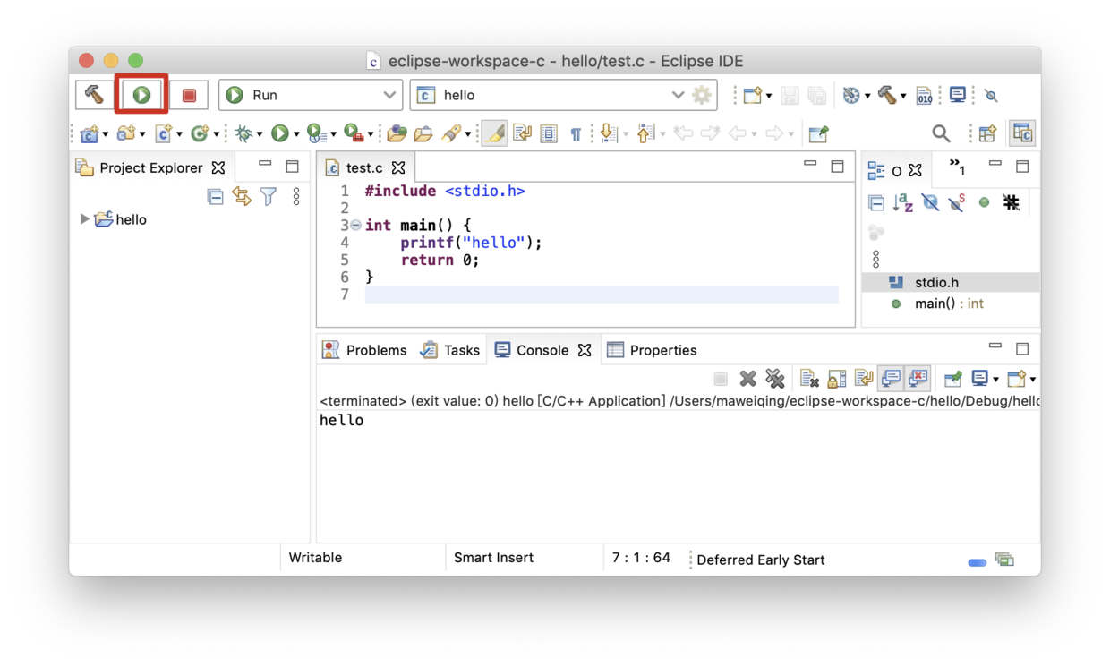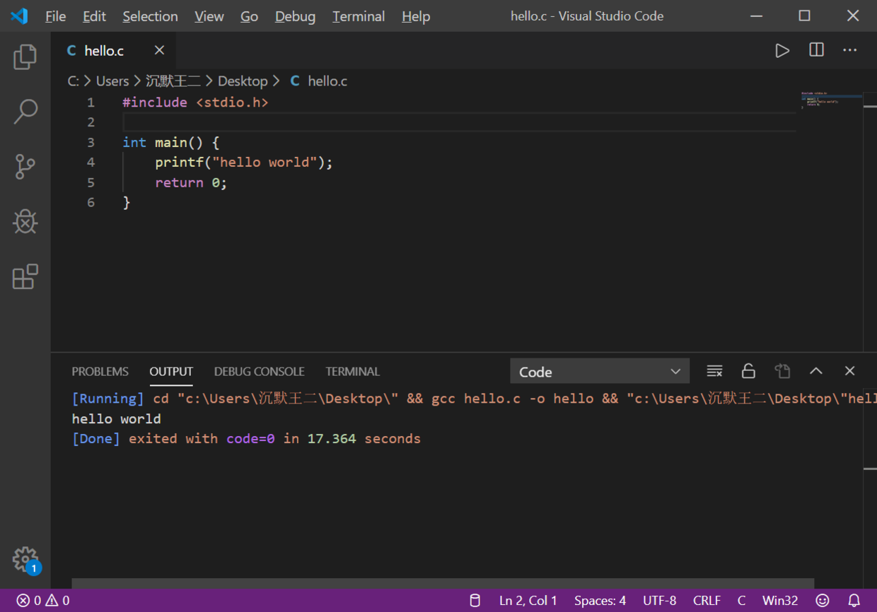 新建一个 hello.c 的文件,把之前那段「hello world」的代码复制过来,保存后点击「运行」按钮,可以在「OUTPUT」面板中看到如下结果——搞定。
