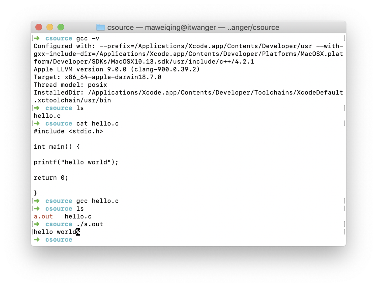 4)如果电脑上安装了 GCC,编写的 C 代码不是特别复杂的话,也可以不用 IDE,直接使用文本编辑器,然后在命令行中运行也是可以的。具体步骤参照下图中的内容。
