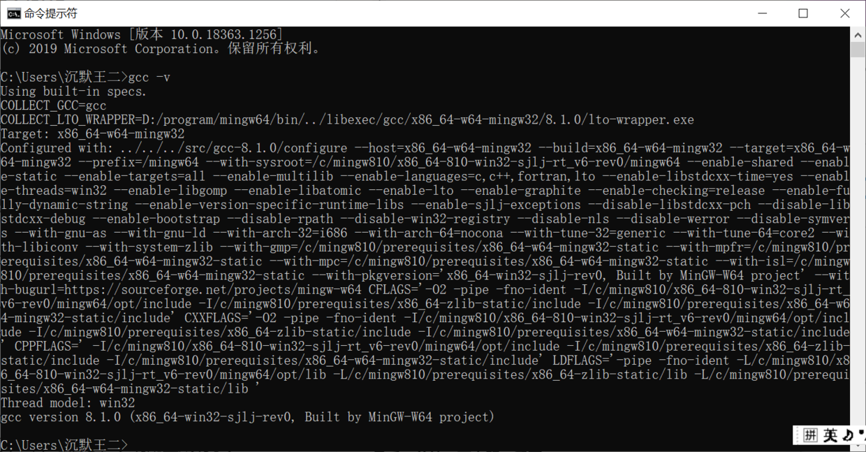 然后启动 cmd,敲入 gcc -v 命令确认是否配置成功。如果出现下图中的信息,表明配置成功了(最后一行是 gcc 的版本号)。