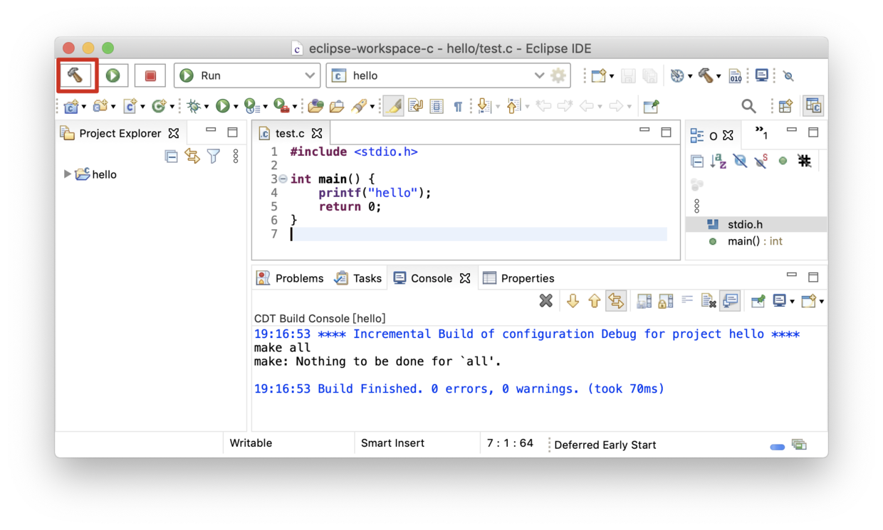 “hello world”的代码编辑完成后,保存,一定要手敲,尽量背会这段简单的代码。然后点击像锤子符号的「Build」按钮对代码进行编译,「Console」 面板会有一段编译的日志输出,如下图所示。