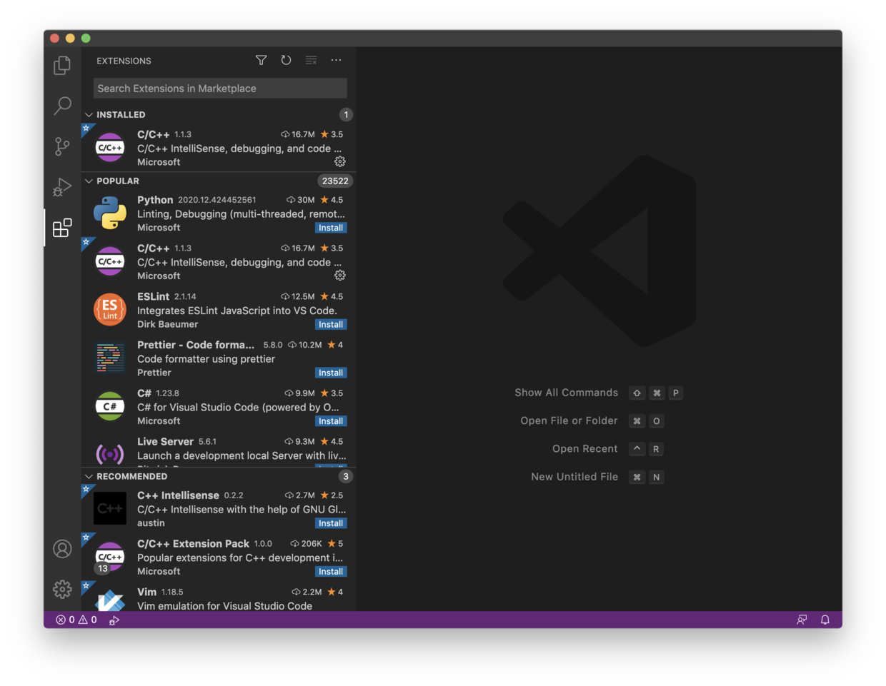 https://visualstudio.microsoft.com/zh-hans/安装成功后打开,选择左侧的插件市场,可以看到很多编程语言的扩展插件,比如 C/C++、Python、C# 等等。我已经把 C/C++ 的插件安装好了,所以上面会显示 INSTALLED。