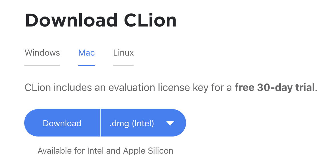 不管是 Windows 平台还是 macOS 平台,或者是 Linux 平台,CLion 都提供了对应的版本可供下载。只不过,商业版只提供了 30 天的免费试用期。