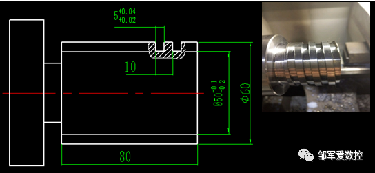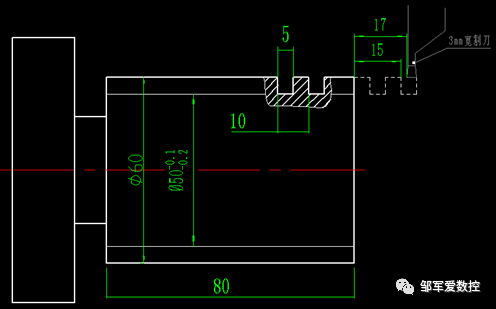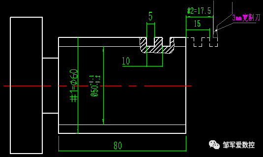 假如3mm割刀的螺纹循环z向起点设定在工件外一点,部分程序如下: