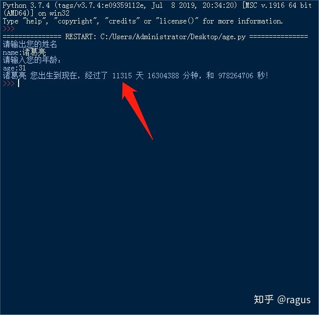 print("请输出您的姓名") name = input("name:") print("请输入您的年龄:") age = int(input("age:")) # 根据年龄计算 days = age * 365 minutes = age * 525948 seconds = age * 31556926 print(name, "您出生到现在,经过了", days,"天", minutes, "分钟,和", seconds, "秒!")