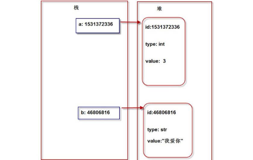 #源码示例 >>> a=3 >>> a 3 >>> id(3) 490005296 >>> type(3) >>> id(a) 490005296 >>> type(a) >>> b="我爱你" >>> b '我爱你' >>> id(b) 59442584 >>> type(b)