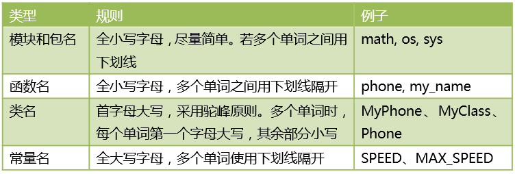 >>> help() help> keywords Here is a list of the Python keywords. Enter any keyword to get more help. False def if raise None del import return True elif in try and else is while as except lambda with assert finally nonlocal yield break for not class from or continue global pass开发中,我们通常约定俗称遵守如下规则: