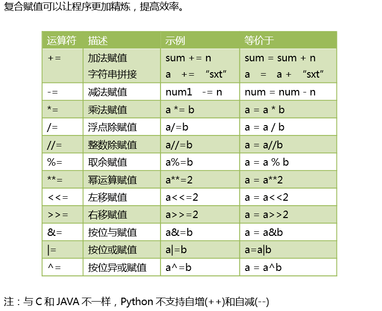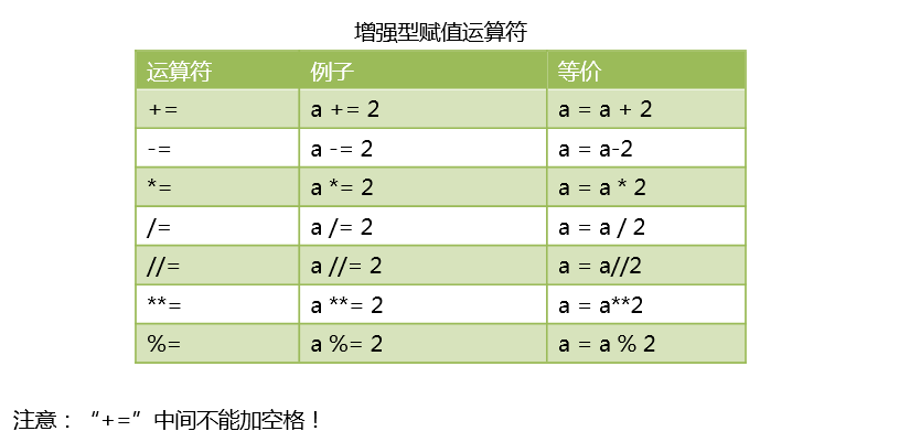 运算符+、-、*,/、//、**和%和赋值符=结合可以构成“增强型赋值运算符”。 a = a + 1 等价于: a +=1