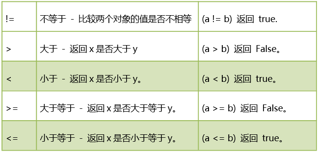 所有比较运算符返回1表示真,返回0表示假。这分别与特殊的变量True和False等价。