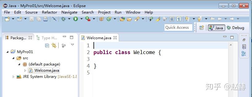 点击Finish后,新建Java类成功,在src下面出现了Welcome.java文件。点击该文件后,出现该文件的代码编辑,