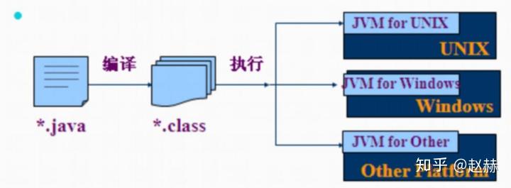 通过不同的“虚拟机”将Java字节码文件解释为对应机器语言并执行。