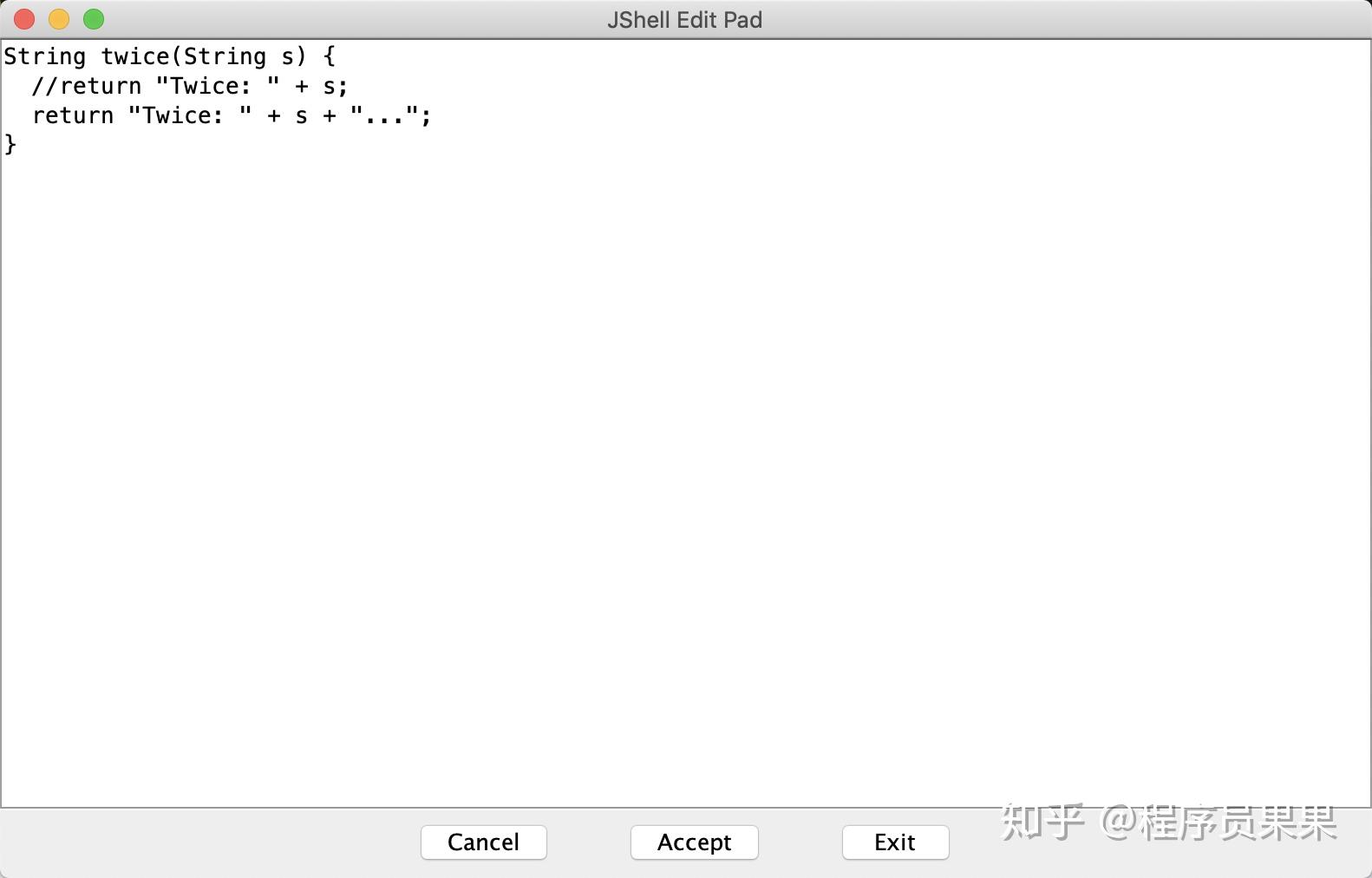 代码修改完成以后,先点击“Accept”按钮,再点击“Exit”按钮,则退出编辑器,在 JShell 命令行中提示方法已经修改。