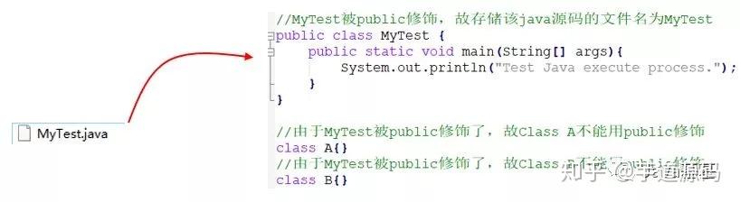 //MyTest被public修饰,故存储该java源码的文件名为MyTest public class MyTest { public static void main(String[] args){ System.out.println("Test Java execute process."); } } //由于MyTest被public修饰了,故Class A不能用public修饰 class A{} //由于MyTest被public修饰了,故Class B不能用public修饰 class B{}(1)java源文件名就是该源文件中public类的名称