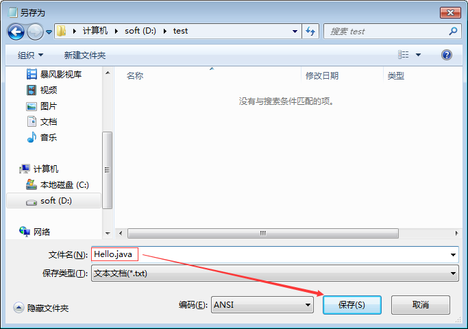 写好之后,另存为Hello.java文件,我这里放在d:/test目录下