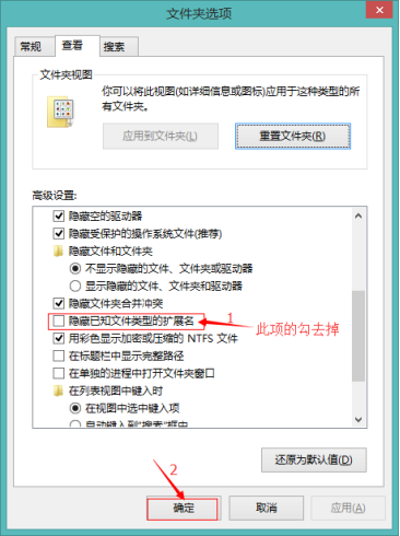 如果看不到文件后缀名,可通过窗口上方“查看”菜单中的“文件夹选择”找到“查看”选项卡,在“查看选择卡”的高级设置找到“隐藏已知文件类型的扩展名”选项,去掉前面的勾,点击“确定”即可显示文件后缀名了。如下图
